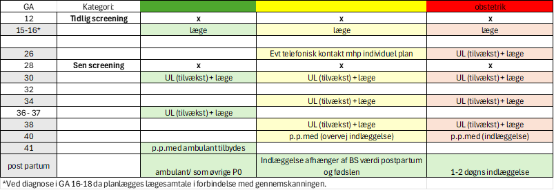 Ved GA 12+0 til 19+6 og GA 24+0 til 27+6 screenes følgende gravide: